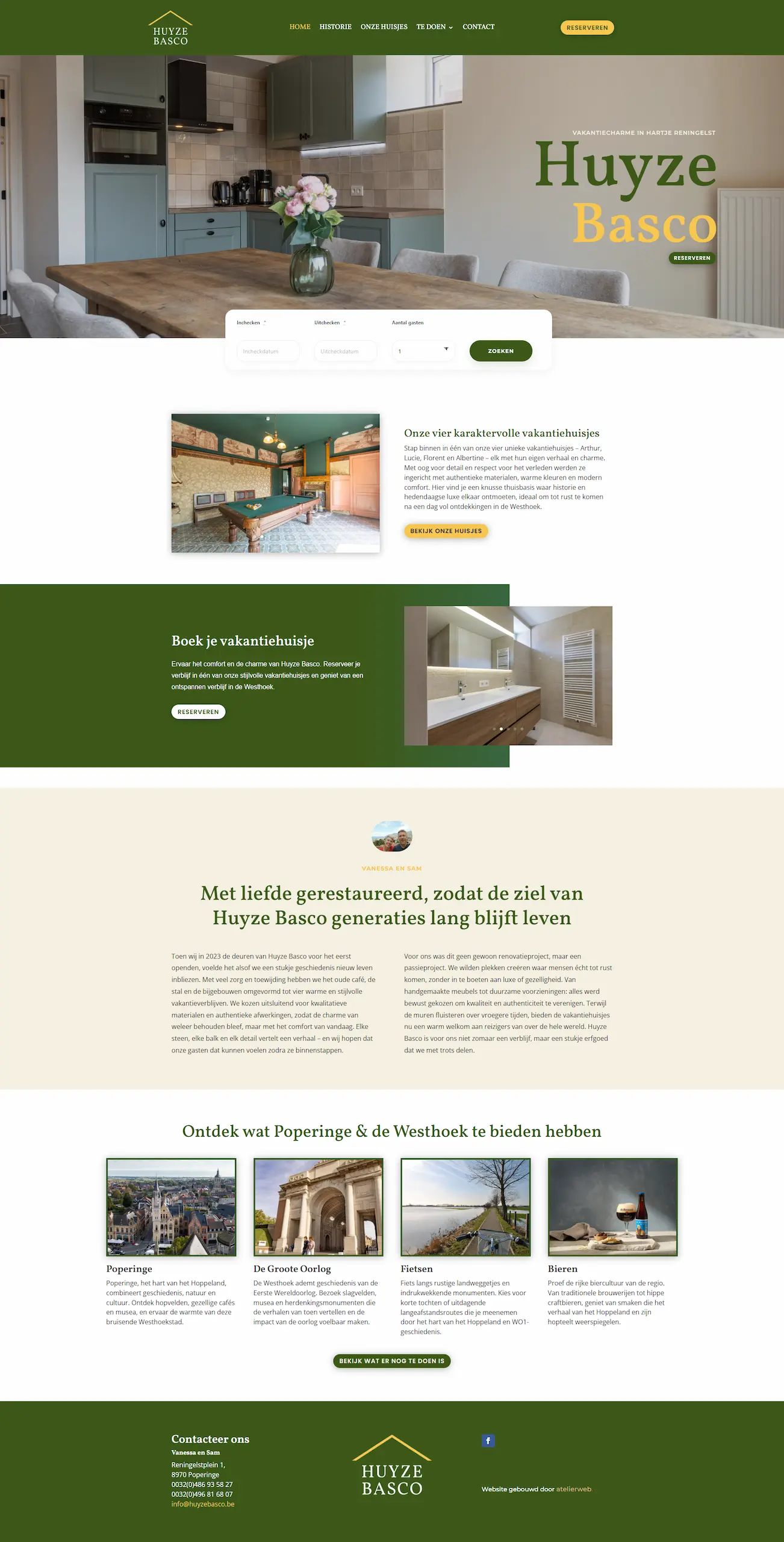 Voor Huyze Basco ontwikkelde Atelier Web een warme, stijlvolle website die perfect aansluit bij de charme van hun vier vakantiehuisjes: Arthur, Lucie, Florent en Albertine. De site vertelt het verhaal van Vanessa en Sam, die met veel liefde een oud café  omvormden tot karaktervolle verblijven. De website is uitgerust met een geïntegreerd boekingssysteem dat automatisch synchroniseert met hun kalender op Booking.com. Zo worden dubbele boekingen voorkomen en kunnen Vanessa en Sam hun gasten zorgeloos verwelkomen. Bovendien hoeven ze dankzij hun eigen boekingsmodule geen hoge commissies meer te betalen aan externe platformen, wat hun rendement én onafhankelijkheid versterkt.